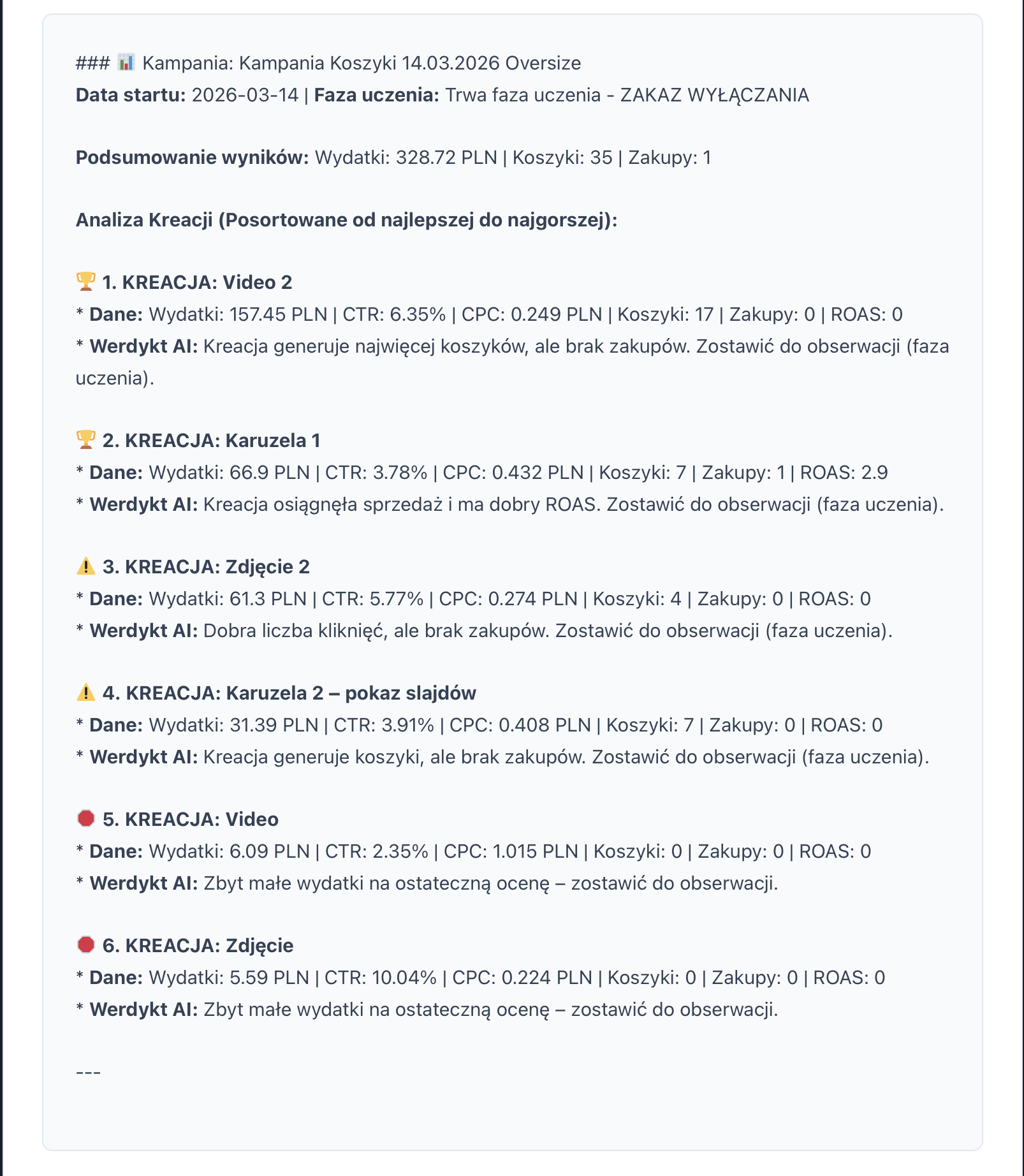 Narzędzie nie ocenia tylko całych kampanii. Schodzi na poziom pojedynczego zdjęcia lub wideo. AI wskaże wprost po nazwach: „Zostaw Zdjęcie 1, bo ma świetny CTR i tanie kliknięcia, wyłącz Video 2, bo generuje same puste wejścia na stronę”.