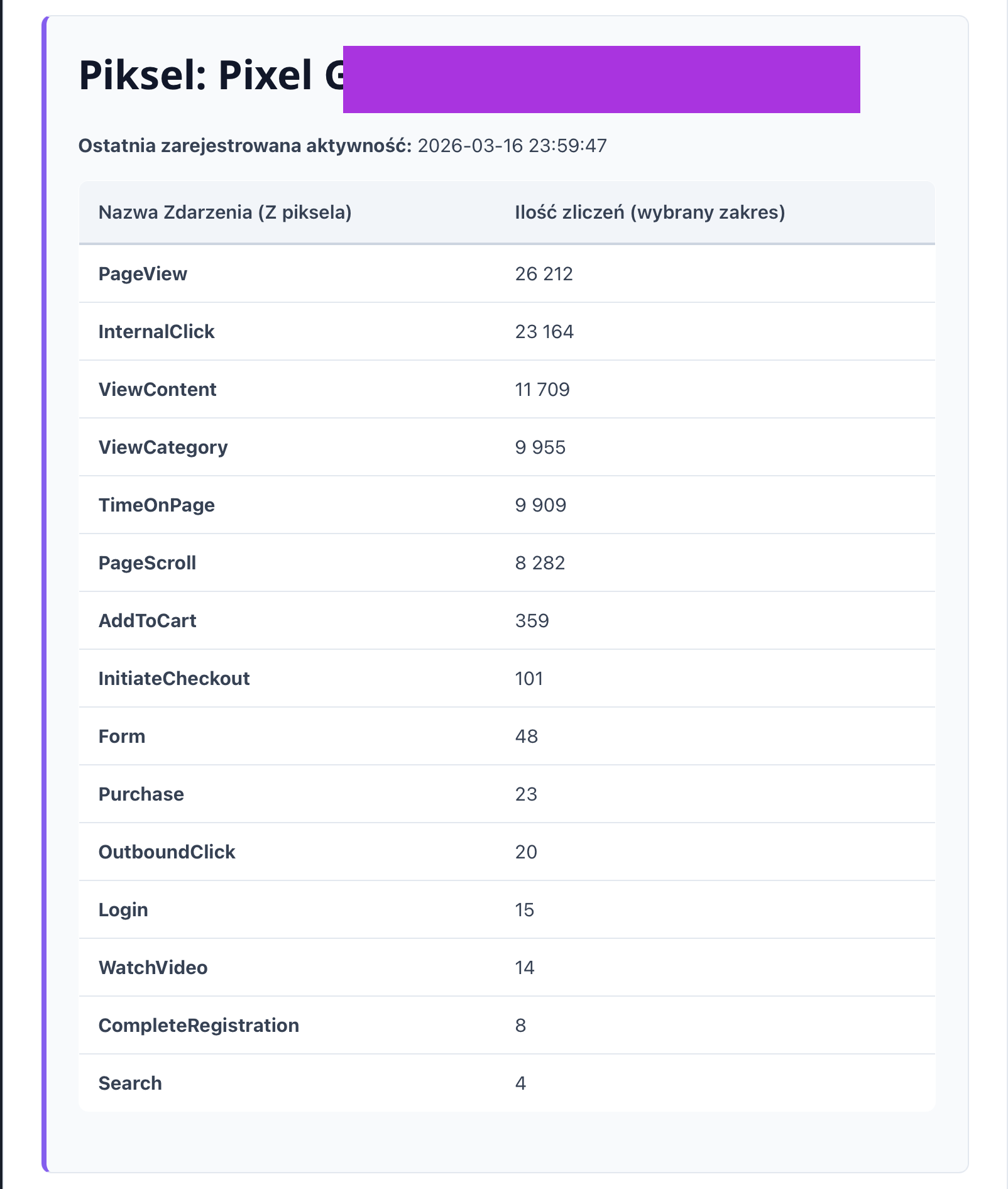 Zanim zaczniesz optymalizować reklamy, musisz mieć pewność, że mierzysz konwersje. Audytor wyposażony jest w moduł sprawdzania Piksela – z dokładnością co do jednego zdarzenia sprawdza, czy strona poprawnie zlicza Page Views, Koszyki i Zakupy w Twoim zakresie dat.
